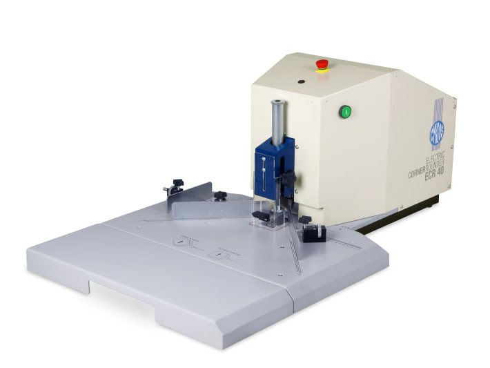 Επαγγελματικός επιτραπέζιος ηλεκτρικός γωνιοκόπτης με δυνατότητα κοπής 40mm / 400 φύλλων 80gsm, με γωνία (RADIUS) 4mm ή 6mm ή 9mm ή 12mm ή 18mm ή φαλτσογωνίας 28mm (45ο) κατόπιν παραγγελίας και 10mm /100 φύλλων 80gsm για κοπή calendar (thumb-cut). Αυτόματο πρεσσάρισμα των φύλλων, οδηγούς γωνιάσματος με μικρορύθμιση ακριβείας, εύκολη αλλαγή των μαχαιριών, εξολοκλήρου στιβαρή μεταλλική κατασκευή.