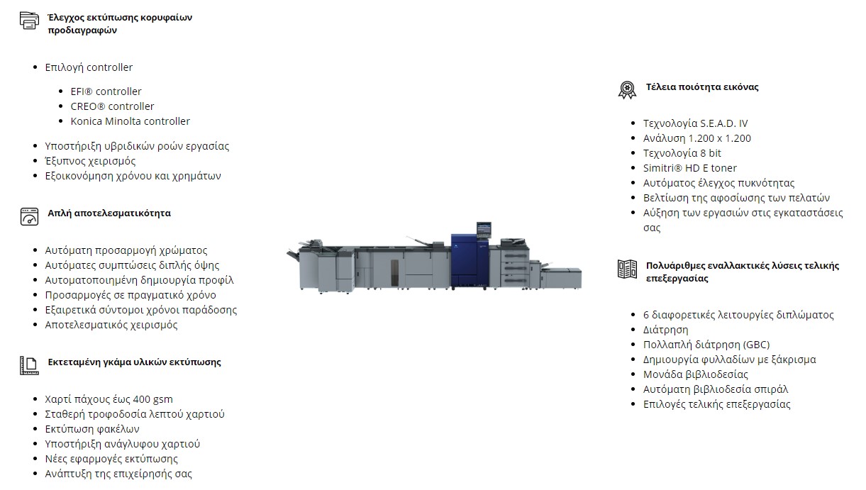 - Ευελιξία με εξειδικευμένες επιλογές τελικής επεξεργασίας, όπως δημιουργία φυλλαδίων, βιβλιοδεσία και αυτόματη βιβλιοδεσία σπιράλ