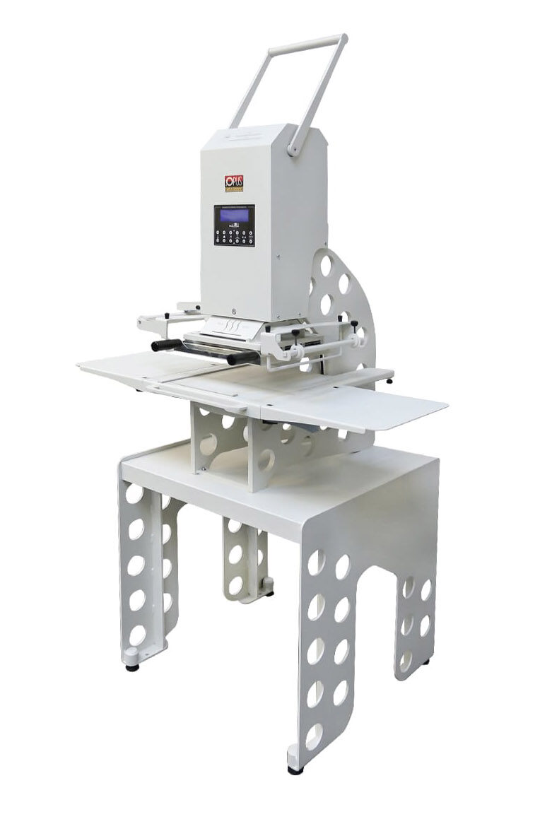 Επαγγελματικό, χειροκίνητο μηχάνημα χρυσοτυπείας – βαθυτυπείας, με μεγάλη επιφάνεια εκτύπωσης 20×20 cm, ρυθμιζόμενη πίεση, ηλεκτρική μετακίνηση του ρολού χρυσοτυπείας με δυνατότητα προγραμματισμού του βήματος, ρύθμιση θερμοκρασίας, χρονομέτρηση με ακουστική ειδοποίηση, ρυθμιζόμενη επιφάνεια εργασίας με δυο οδηγούς γωνιάσματος και 12 οδηγούς ρύθμισης ύψους, ηλεκτρονικό display, δυνατότητα χρήσης καλουπιών και γραμμάτων, μεταλλική επιδαπέδια βάση και εξολοκλήρου στιβαρή μεταλλική κατασκευή.